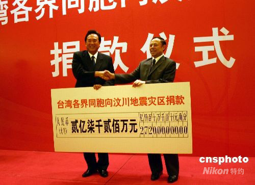 9月8日,受海峽交流基金會(huì)委托,海協(xié)會(huì)會(huì)長(zhǎng)陳云林抵成都向汶川地震災(zāi)區(qū)轉(zhuǎn)交臺(tái)灣同胞自發(fā)捐助的二億七千二百萬元人民幣。圖為陳云林(左)向四川方面轉(zhuǎn)交臺(tái)灣同胞捐款。中新社發(fā) 黃永莉 攝