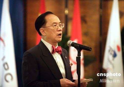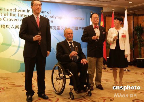 九月十日,香港行政長官曾蔭權(quán)在酒店舉行午宴,歡迎殘奧委員會(huì)主席克雷文爵士訪港。午宴前曾蔭權(quán)、克雷文爵士在歡迎午宴上分別致辭。 中新社發(fā) 張勤 攝