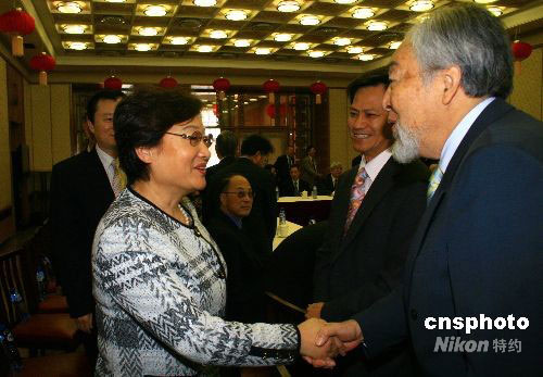 圖為李海峰主任與英國(guó)著名僑領(lǐng)單聲握手問候。