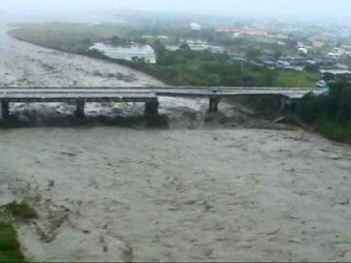 因森拉克臺(tái)風(fēng)豪雨影響,臺(tái)灣臺(tái)中縣后豐大橋日前發(fā)生斷裂垮塌,造成三車(chē)六人墜落橋下遭滾滾洪水沖走慘劇。圖為空中勤務(wù)總隊(duì)直升機(jī)空拍斷橋全景的鏡頭。“中央社”圖