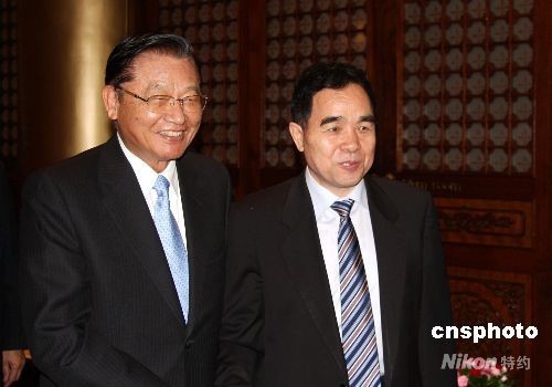 9月19日,臺灣海基會董事長江丙坤在臺北圓山飯店,會見率團前來臺灣參加海峽兩岸出版交流二十周年紀念活動的部分大陸代表團成員時,與新聞出版署署長柳斌杰(右)在一起。中新社發(fā) 陳立宇 攝