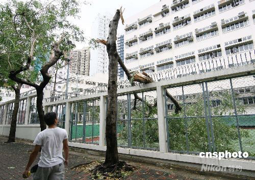臺風(fēng)“黑格比”襲過香港后,九月二十四日早減弱為三號強(qiáng)風(fēng),香港所有上午校及全日制學(xué)校繼續(xù)停課。圖為灣仔區(qū)一棵大樹被吹折,倒落于一中學(xué)的操場內(nèi)。中新社發(fā) 武仲林 攝