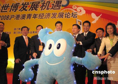 10月7日,“2008滬港澳青年經(jīng)濟(jì)發(fā)展論壇”在上海舉行。來(lái)自滬港澳三地的青年企業(yè)家、專家學(xué)者、學(xué)生領(lǐng)袖等400余人參加論壇,探討上海世博會(huì)的發(fā)展機(jī)遇與青年責(zé)任等話題。論壇由上海市青年聯(lián)合會(huì)、香港青年聯(lián)會(huì)、澳門青年聯(lián)合會(huì)等共同主辦,在上海、香港、澳門三地每年一屆、輪替舉行,今年為第十年。圖為滬港澳三地青年代表與上海世博會(huì)吉祥物“海寶”牽手,啟動(dòng)論壇。中新社發(fā) 許曉青 攝