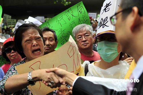 十月八日,過百名受雷曼迷你債券事件影響的香港市民,在香港立法會(huì)前請(qǐng)?jiān)。圖為民建聯(lián)立法會(huì)議員劉江華(右)與請(qǐng)?jiān)刚邥?huì)面。中新社發(fā) 譚達(dá)明 攝