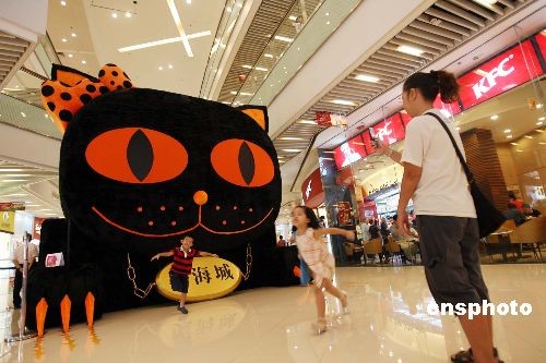 臨近西方萬圣節(jié),香港一些商場為催谷顧客消費,紛紛布置應(yīng)屆裝飾吸引人流。圖為兩名小童在奧海城萬圣節(jié)布景前嬉戲玩耍。中新社發(fā) 洪少葵 攝