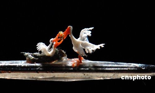 圖為臺(tái)灣著名微雕家陳逢顯的新作“母愛真情”。放在針孔上,只有小沙粒那么大。陳逢顯說,這是他應(yīng)大陸微雕界人士的邀約,為慰問汶川大地震受災(zāi)同胞而作。中新社發(fā) 陳立宇 攝