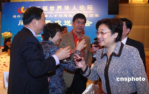 10月29日晚,第五屆世界華人論壇在北京閉幕。國務(wù)院僑辦主任李海峰出席歡送宴會并向參會代表們敬酒致意。中新社發(fā) 廖文靜 攝