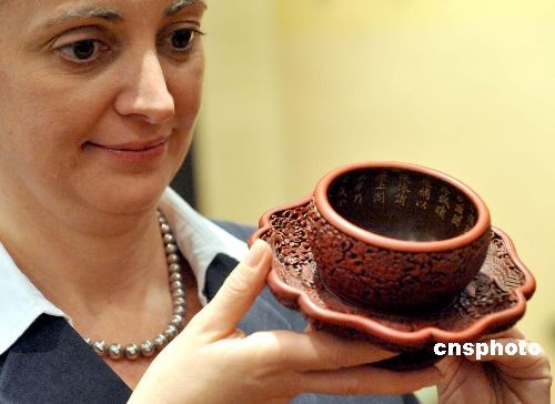 明朝永樂(lè)乾隆御題剔紅雙鳳蓮花盞托。