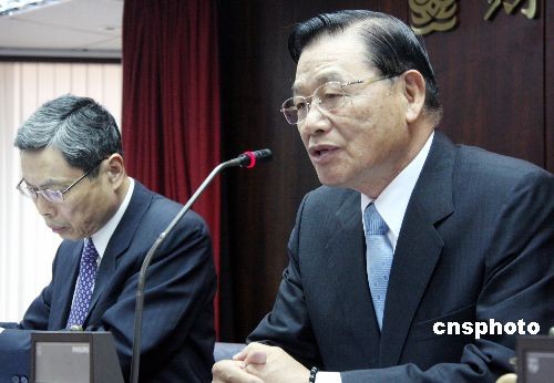11月1日下午,;鶗谂_北舉行記者會,公布海協(xié)會會長陳云林5天訪臺行程,并披露兩會參加協(xié)商代表團(tuán)名單。經(jīng)海協(xié)會先遣人員與;鶗矫娴淖詈蟠_認(rèn),陳云林率74人的海協(xié)會代表團(tuán)將于11月3日從北京乘包機(jī)飛抵桃園機(jī)場,而廣受矚目的今年兩會第二次“陳江會”將于11月4日舉行,并簽署協(xié)議。圖為;鶗麻L江丙坤和副董事長高孔廉在會上回答記者提問。中新社發(fā) 黃少華 攝