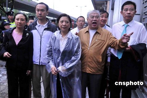 十一月三日,香港民建聯(lián)副主席蔣麗蕓(右三)及立法會議員黃定光(右二),與幾十名中小企的代表早上由遮打花園游行至政府總部,他們不滿銀行縮減信貸額,令營運資金緊絀,難以周轉。中新社發(fā) 譚達明 攝