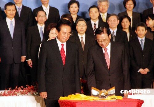11月4日下午,海協(xié)會會長陳云林和;鶗麻L江丙坤簽署有關(guān)兩岸空運直航、海運直航、郵政、食品安全的4項協(xié)議。圖為協(xié)議文本簽署后,陳云林向江丙坤致贈水晶作品《握手》。中新社發(fā) 黃少華 攝