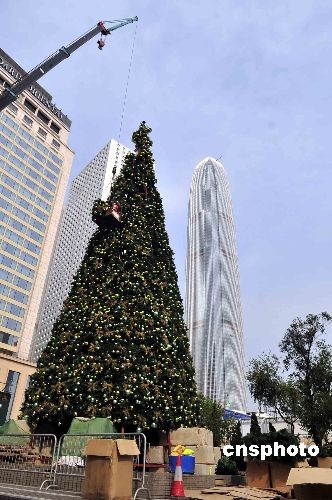 十一月十九日,香港工人正在港島中環(huán)地區(qū)裝巨型圣誕樹。香港特區(qū)旅發(fā)局今年覓得置地公司贊助,在皇后像廣場(chǎng)再亮起高三十米的圣誕樹,為香港繽紛冬日營(yíng)造更好的節(jié)日氣氛。中新社發(fā) 譚達(dá)明 攝