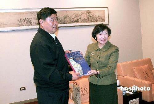 11月24日,國(guó)家文物局局長(zhǎng)、中華文物交流協(xié)會(huì)會(huì)長(zhǎng)單霽翔(左)率大陸多位文物界人士,參訪臺(tái)北故宮博物院,并與臺(tái)北故宮博物院院長(zhǎng)周功鑫互贈(zèng)禮物。中新社發(fā) 周兆軍 攝