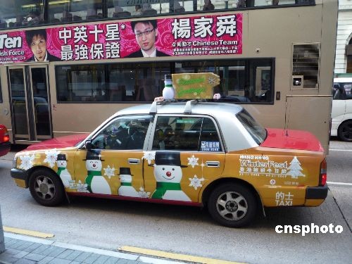 2008年12月20日,香港尖沙咀彌敦道出現(xiàn)“圣誕的士”。隨著圣誕節(jié)的臨近,香港一些出租車在車外殼畫(huà)上圣誕圖畫(huà),烘托香港圣誕節(jié)氛圍。中新社發(fā) 姜純 攝