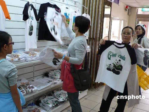 大陸贈臺大熊貓“團團”“圓圓”十二月二十三日晚間抵達(dá)臺北市立動物園。動物園內(nèi)紀(jì)念品商店里的大熊貓相關(guān)商品進貨數(shù)量激增,民眾購買熱情高漲。圖為臺灣民眾在選購印有大熊貓圖案的T恤衫。中新社發(fā) 路梅 攝