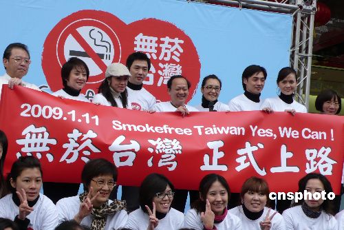 臺(tái)灣新“煙害防制法”十一日起正式實(shí)施,三人以上室內(nèi)職場(chǎng)及公共空間禁煙,至少影響五十萬(wàn)個(gè)場(chǎng)所,煙品促銷(xiāo)廣告也大幅限縮,違者加重罰則!靶l(wèi)生署”署長(zhǎng)葉金川(右四)十日在街頭宣導(dǎo)臺(tái)灣煙害防制新法,呼吁大家共創(chuàng)無(wú)煙臺(tái)灣。中新社發(fā) 路梅 攝