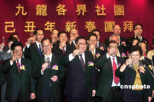 二月六日,九龍地區(qū)事務(wù)聯(lián)會(huì)聯(lián)席會(huì)議及九龍社團(tuán)聯(lián)會(huì)等在香港一酒店舉行新春酒會(huì),各界嘉賓濟(jì)濟(jì)一堂,場面熱鬧。中聯(lián)辦主任高祀仁(前中)及香港特區(qū)民政事務(wù)局局長曾德成(前左二)等帶領(lǐng)眾嘉賓祝酒。中新社發(fā) 譚達(dá)明 攝
