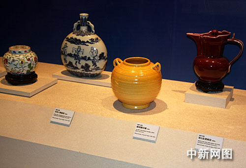 近日,為推廣臺(tái)北故宮“周末夜”活動(dòng),臺(tái)北故宮博物院在臺(tái)北火車站設(shè)置長(zhǎng)箱型玻璃廣告廊,以高仿真度的館藏文物進(jìn)行宣介。圖為展示的仿明代前期官營(yíng)作坊的瓷器。 中新社記者 陳立宇 攝