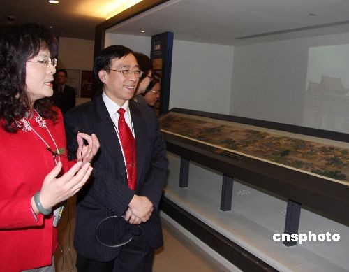 2月26日,上海博物館館長陳燮君(中)一行應(yīng)邀抵達(dá)臺北參訪。圖為陳燮君一行在臺北故宮參觀,聽工作人員介紹結(jié)合了聲光效果的《清明上河圖》復(fù)制品。中新社發(fā) 路梅 攝
