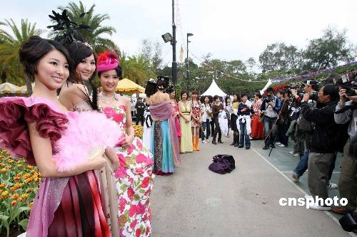 三月十二日,應(yīng)屆香港小姐陳倩揚(yáng)、高海寧、馬賽盛裝打扮,在香港維園花展內(nèi)為“萬花喜迎東亞運(yùn)”攝影比賽當(dāng)日造型模特,活動(dòng)吸引數(shù)百影友入場拍攝。中新社發(fā) 洪少葵 攝