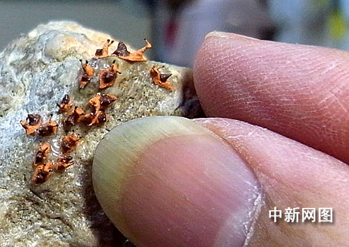 圖為臺灣著名微雕家陳逢顯創(chuàng)作的世界最小“蝸牛”群,每只蝸牛的殼、觸角、眼睛兼具,有形有神。中新社記者 陳立宇 攝