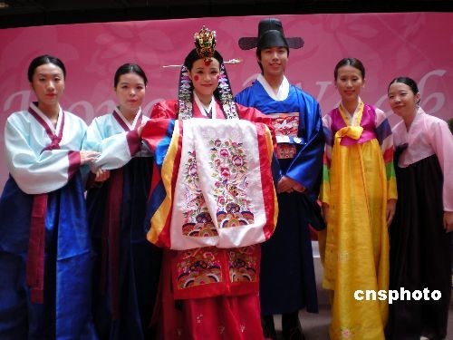 為促進中韓文化交流,一場別開生面的傳統(tǒng)韓國婚禮示范二十日在香港城市大學(xué)舉行。演示婚禮的城大師生及旅港韓國僑民,身穿傳統(tǒng)的韓國婚禮服飾,在傳統(tǒng)韓國音樂中,重現(xiàn)傳統(tǒng)韓國婚禮的各項細(xì)節(jié),包括奠雁禮、交拜禮、合巹禮等。中新社發(fā) 陳伊敏 攝