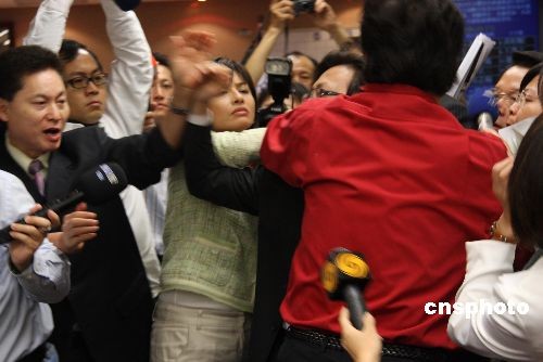 四月二十二日上午,臺灣“立法院內(nèi)政委員會”邀請“陸委會”主委賴幸媛、;鶗貢L高孔廉等人報告即將舉行的第三次“陳江會談”。據(jù)臺灣中央社報道:中國國民黨籍“立委”李慶華在進行程序發(fā)言時,民進黨籍“立委”邱議瑩在臺下表達不滿意見,引發(fā)李慶華不滿,要邱議瑩“有點家教”,邱議瑩(左四穿白衣女性)與李慶華(穿紅衣男性)爆發(fā)口角,并突然從后面打李慶華一巴掌。李慶華下午到臺北地檢署,按鈴控告邱議瑩傷害及公然侮辱罪。圖為本社記者在“立法院”采訪時拍攝到的情景。中新社發(fā) 耿軍 攝