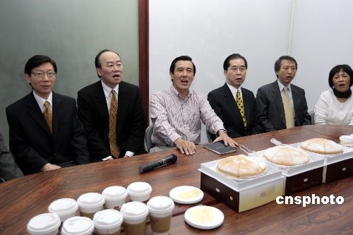 3月30日,臺(tái)灣地區(qū)領(lǐng)導(dǎo)人選舉當(dāng)選人馬英九(左二)在國民黨中央黨部大樓接見女師附小小學(xué)同學(xué),在會(huì)見室里一起唱起校歌并切蛋糕表示慶祝。中新社發(fā) 杜洋 攝