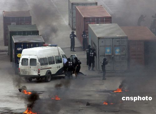 圖為情景設(shè)置:國(guó)際恐怖組織策劃武裝劫持開(kāi)往A國(guó)的集裝箱,海港公安阻截并捉拿藏匿在集裝箱內(nèi)的恐怖分子。中新社發(fā) 潘索菲 攝