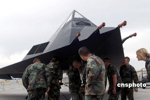 美國(guó)為紀(jì)念六十年前成立空軍,十一月在內(nèi)華達(dá)州的內(nèi)利斯空軍基地舉辦大規(guī)模飛機(jī)展示,美軍人員貼身參觀世界上第一種可正式作戰(zhàn)的隱型戰(zhàn)斗機(jī)F-117A“夜鷹”,此極專門(mén)用于夜間攻擊。中新社發(fā) 賈國(guó)榮 攝