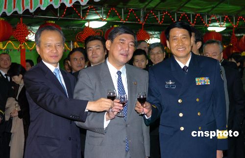 11月30日晚,正在日本進行正式友好訪問的中國海軍導彈驅逐艦“深圳號”在甲板舉行招待會,日本防務大臣石破茂、海軍司令吉川榮治,中國駐日大使崔天凱、公使孔鉉佑、武官徐京明等出席,日本107護衛(wèi)艦官兵代表及各國駐日武官三百多人參加。圖為崔天凱大使(左)、石破茂防務大臣(中)和中國海軍軍艦訪日團指揮員、南海艦隊副司令肖海洋少將,共同舉杯祝愿中日兩國世代友好。中新社發(fā) 滕劍峰 攝