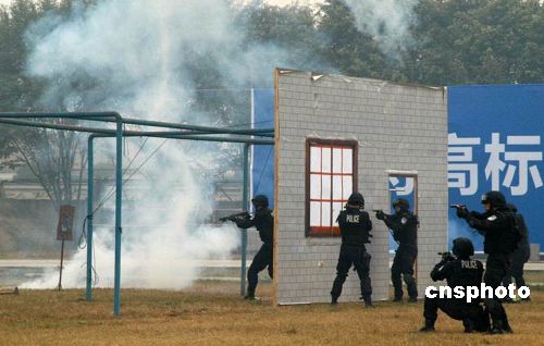 十二月二十八日,廣東佛山公安特警、武警舉行技戰(zhàn)演練,在反劫持人質(zhì)綜合演練中,佛山特警為了解救被“劫持”的5名國家重點(diǎn)項(xiàng)目科技人員,在反恐指揮部的指令下,地面攻擊組、車輛突擊組、垂降組、情報(bào)組、爆破組、談判組迅速到達(dá)指定位置待命,然后以迅雷不及掩耳之勢發(fā)起立體攻擊,瞬間將恐怖分子擊斃,安全解救人質(zhì)。中新社發(fā) 孫建駒 攝