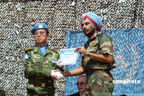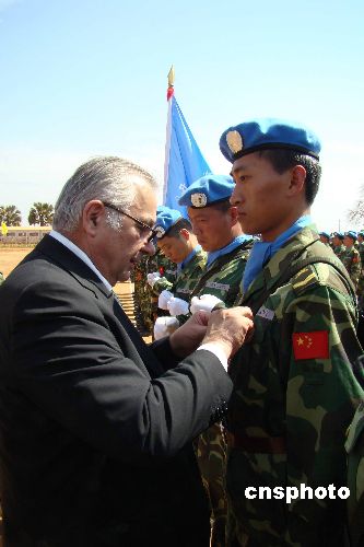 2月7日,聯(lián)合國(guó)駐蘇丹特派團(tuán)(聯(lián)蘇團(tuán))在中國(guó)的傳統(tǒng)節(jié)日--春節(jié)這一天舉行隆重的授勛儀式,破例提前兩個(gè)月為中國(guó)赴蘇丹瓦烏435名維和官兵授予聯(lián)合國(guó)“和平榮譽(yù)勛章”,以表彰他們?cè)趫?zhí)行任務(wù)時(shí)的卓越表現(xiàn)。聯(lián)合國(guó)秘書長(zhǎng)駐蘇丹特別代表卡齊先生、聯(lián)蘇團(tuán)總司令里德爾中將從首都喀土穆趕來親自為維和官兵授勛并與官兵一起歡度春節(jié)。中新社發(fā) 甄玉改 攝