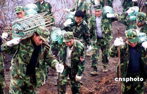 2月19日,預(yù)備役戰(zhàn)士為賀州市海拔1000多米的電網(wǎng)搶修工地運(yùn)送“懸式玻璃絕緣子”。2月17日,廣西軍區(qū)組織部隊民兵預(yù)備役1100人奔赴賀州市,參加廣西電網(wǎng)遭受冰災(zāi)損失最嚴(yán)重、修復(fù)工程量最大的“萬道線220千伏”電網(wǎng)搶修大決戰(zhàn)。戰(zhàn)士們開山路、頂風(fēng)雨、踏泥濘,采用肩扛背馱的方式,僅用3天時間就將300多噸的電網(wǎng)搶修物資全部安全運(yùn)送到海拔400--1000多米、長30公里的高山工地上,為全面修復(fù)賀州電網(wǎng)贏得了時間。中新社發(fā) 喻湘泉 攝