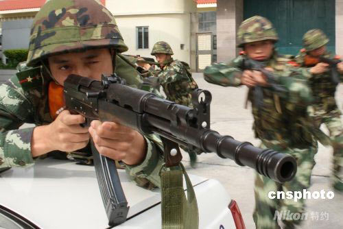 5月10日,武警福建總隊(duì)泉州支隊(duì)反恐分隊(duì)進(jìn)行了一場以奧運(yùn)圣火受到干擾和遭到破壞為背景的實(shí)戰(zhàn)演練,為奧運(yùn)圣火在福建順利傳遞提供安全保障。圖為反恐分隊(duì)的武警官兵們正在進(jìn)行“反騷亂”演練。中新社發(fā) 張九強(qiáng) 攝