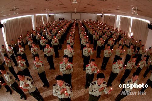 5月14日,武警河北總隊(duì)石家莊市支隊(duì)機(jī)動(dòng)大隊(duì)的官兵們,點(diǎn)燃手中的蠟燭,唱響“祝你平安”、“讓世界充滿愛”等歌曲,為在四川汶川等地地震災(zāi)害中受災(zāi)的同胞祈福。中新社發(fā) 余洪恩 攝