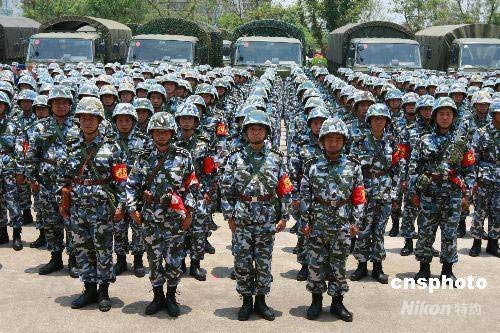 5月14日13時,中國南海艦隊海軍陸戰(zhàn)隊某旅搶險救災(zāi)部隊第一梯隊760名官兵緊急起程奔赴四川汶川地震災(zāi)區(qū)。第一梯隊的760人采取摩步化機(jī)動方式行進(jìn),預(yù)計48小時后抵達(dá)汶川災(zāi)區(qū)。中國南海艦隊海軍陸戰(zhàn)隊將累計出動官兵2500名。中新社發(fā) 李唐 攝