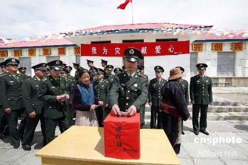 5月16日,駐守在海拔4500多米的西藏兵站部某大站黑河兵站官兵拿出津貼向四川災(zāi)區(qū)民眾獻(xiàn)上一份愛心。中新社發(fā) 樊厚東 攝