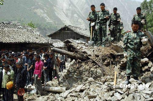 5月19日下午2點28分,武警汶川搶險救災(zāi)官兵在救援現(xiàn)場向地震死難者默哀。中新社發(fā) 陳文 攝