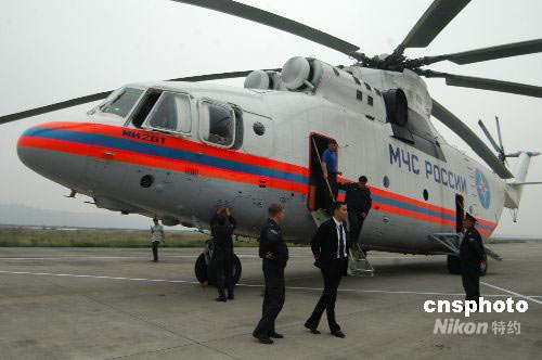 5月25日下午17時45分,一架俄羅斯米-26重型運輸直升機降落四川綿陽南郊機場。據(jù)俄羅斯機長安東介紹,米-26重型運輸直升機可24小時晝夜飛行,可在能見度600米、高度60米的空域執(zhí)行任務(wù)。10名機組人員經(jīng)常參與國際救援任務(wù),對山區(qū)復(fù)雜地形執(zhí)行救援任務(wù)有著豐富經(jīng)驗。米-26是目前世界上最大的直升機,被稱為“空中巨無霸”,一次運載能力達20噸。中新社發(fā) 成和平 攝