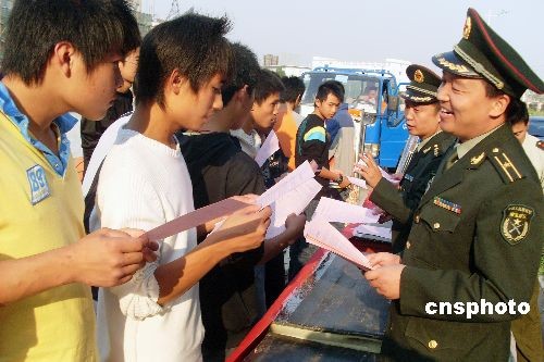 10月15日,江蘇省鎮(zhèn)江市潤州區(qū)人武部干部在向第三職教中心的學(xué)生宣傳征兵新政策。當(dāng)日,江蘇省鎮(zhèn)江市潤州區(qū)人武部干部分別走進轄區(qū)內(nèi)的鎮(zhèn)江市第三職教中心和江蘇科技大學(xué),結(jié)合今年冬季征兵新政策,重點面向大學(xué)和高中的應(yīng)屆畢業(yè)生開展征兵宣傳,鼓勵廣大學(xué)子積極應(yīng)征入伍,為祖國的國防建設(shè)出力。中新社發(fā) 石玉成 攝