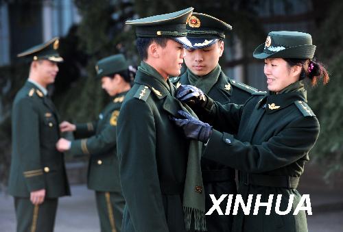 11月10日,青島公安邊防支隊(duì)官兵正在試穿07式冬季軍服。當(dāng)日,武警山東總隊(duì)、山東公安邊防總隊(duì)開始換發(fā)武警07式冬季軍服。新款冬裝分為冬常服、常服大衣和制式毛衣,均為深橄欖綠色,冬常服由關(guān)領(lǐng)改為開領(lǐng),毛上衣可佩戴肩章作外衣穿著,軍官常服大衣可佩戴圍巾。新華社記者 李紫恒攝