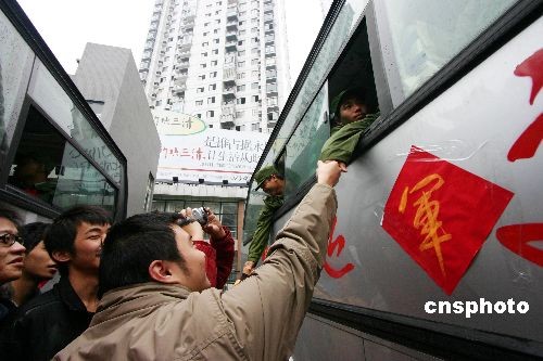 11月19日,進(jìn)藏新兵在親人們的歡送下離開(kāi)家鄉(xiāng)。當(dāng)日,重慶市永川區(qū)首批進(jìn)藏新兵在區(qū)人武部大院集中,完成了相關(guān)交接手續(xù)后,新兵們?cè)谟H人的祝福聲中,登上大巴車(chē)依依不舍地告別親人、告別故鄉(xiāng),踏上了保家衛(wèi)國(guó)的征程。中新社發(fā) 陳仕川 攝