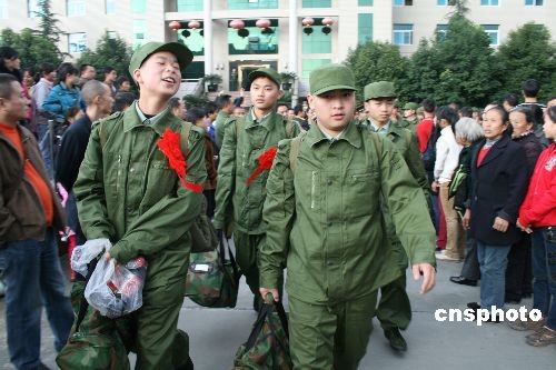 11月23日,四川眉山市首批奔赴西藏服役的新兵,告別家鄉(xiāng)踏上保衛(wèi)祖國的征程。在今年的冬季征兵中,作為地震災(zāi)區(qū)的眉山市廣大適齡青年,被來到當(dāng)?shù)貐⒓涌拐鹁葹?zāi)的英勇的部隊官兵所感動,紛紛報名應(yīng)征入伍,其中還有不少災(zāi)區(qū)青年和在災(zāi)區(qū)做志愿者的青年踴躍報名。中新社發(fā) 堯遙 攝