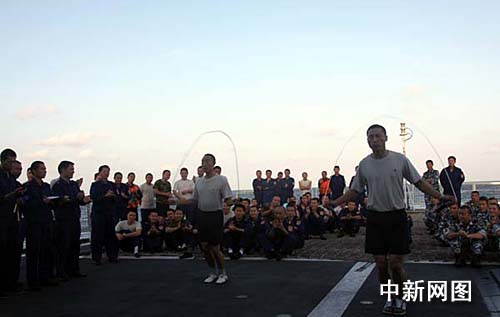 中新網(wǎng)“?凇迸1月10日電 當?shù)貢r間1月10日下午,正在亞丁灣海域執(zhí)行護航任務(wù)的“海口”號導(dǎo)彈驅(qū)逐艦繼續(xù)舉行甲板運動會,參賽官兵參加跳繩項目比賽。
