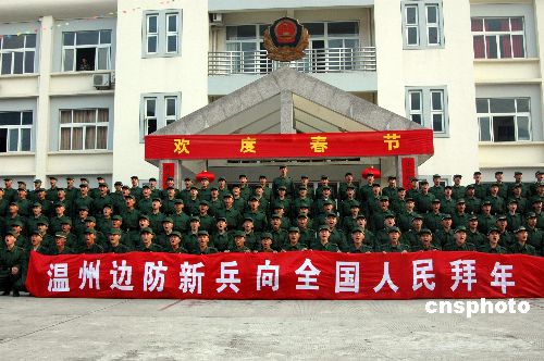 1月24日,駐守在東海之濱的浙江溫州邊防支隊(duì)全體新戰(zhàn)士在第二故鄉(xiāng)向全國人民拜年,祝祖國繁榮昌盛,祝人民新春快樂!中新社發(fā) 吳水斌 攝
