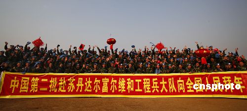 新春佳節(jié)到來之際,正在蘇丹達爾富爾執(zhí)行維和任務(wù)的濟南軍區(qū)某裝甲師官兵向全國人民拜年。中新社發(fā) 畢華明 攝