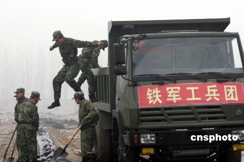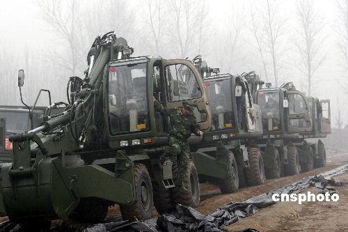 2月7日,鐵軍官兵在黃河岸邊進(jìn)行導(dǎo)流渠開挖施工前的準(zhǔn)備工作。當(dāng)日濟(jì)南軍區(qū)鐵軍工兵團(tuán)200多名官兵攜99臺工程裝備開進(jìn)河南封丘黃河岸邊,開始搶挖抗旱導(dǎo)流渠。這條導(dǎo)流渠長約2300米,約需5天時(shí)間開挖完畢。黃河水經(jīng)此導(dǎo)流渠進(jìn)入當(dāng)?shù)毓喔惹,將對黃河以北的河南新鄉(xiāng)市、安陽市等灌區(qū)的265萬畝進(jìn)行灌溉,以解大旱之急。中新社發(fā) 張曉理 攝