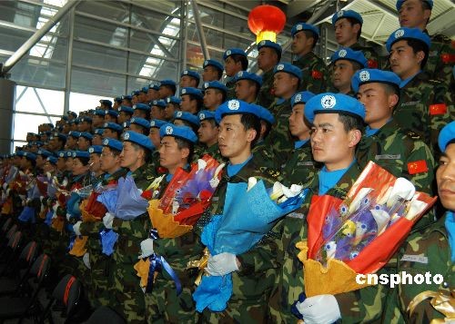 2月16日下午,中國(guó)第五批赴蘇丹維和部隊(duì)第一梯隊(duì)出征儀式在河南省鄭州市新鄭國(guó)際機(jī)場(chǎng)舉行。中國(guó)第五批赴蘇丹維和部隊(duì)共由375名官兵組成,包括一支工兵大隊(duì),一支運(yùn)輸大隊(duì)和一支醫(yī)療分隊(duì)。此次出征的第一梯隊(duì)共105人,包括工兵大隊(duì)40人,運(yùn)輸大隊(duì)30人,醫(yī)療分隊(duì)35人。他們將于當(dāng)?shù)貢r(shí)間17日10時(shí)左右到達(dá)蘇丹歐拜伊德,隨后轉(zhuǎn)乘聯(lián)合國(guó)包機(jī)飛赴瓦烏任務(wù)區(qū)。其余維和人員將于本月陸續(xù)抵達(dá)任務(wù)區(qū)。 中新社發(fā) 李亮 攝