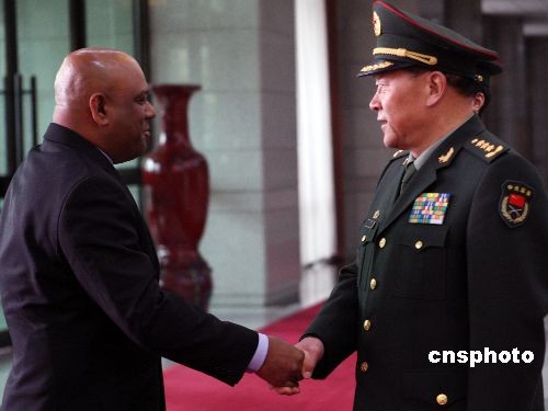 2月19日下午,國(guó)務(wù)委員兼國(guó)防部長(zhǎng)梁光烈上將在北京八一大樓會(huì)見(jiàn)來(lái)訪的馬爾代夫國(guó)防與國(guó)家安全部長(zhǎng)費(fèi)薩爾一行。中新社發(fā) 宋吉河 攝